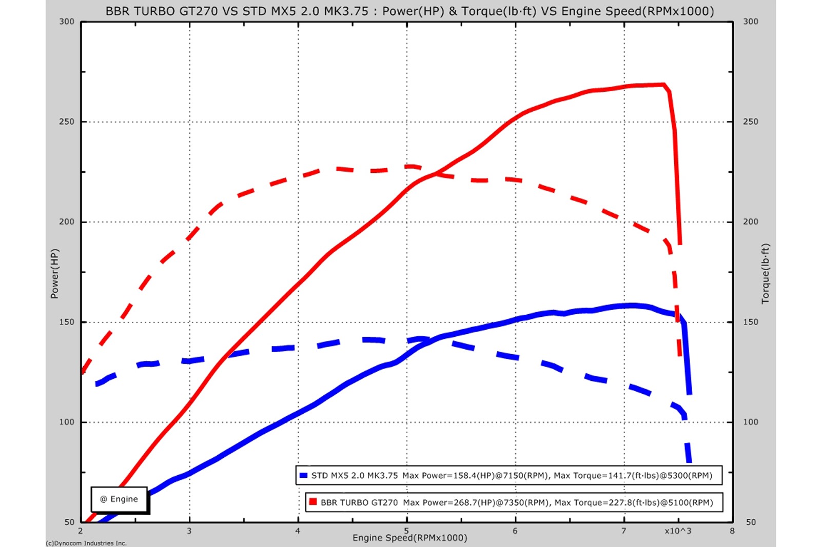 El paquete GT270 da el Mazda MX- 5 268hp ( 270PS ) y 227 lb-pie ( 307 Nm ) de par motor , gracias a la instalación de un turbocompresor Garrett GT25 , colector de escape e intercooler , así como las actualizaciones electrónicas avanzadas.